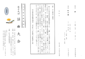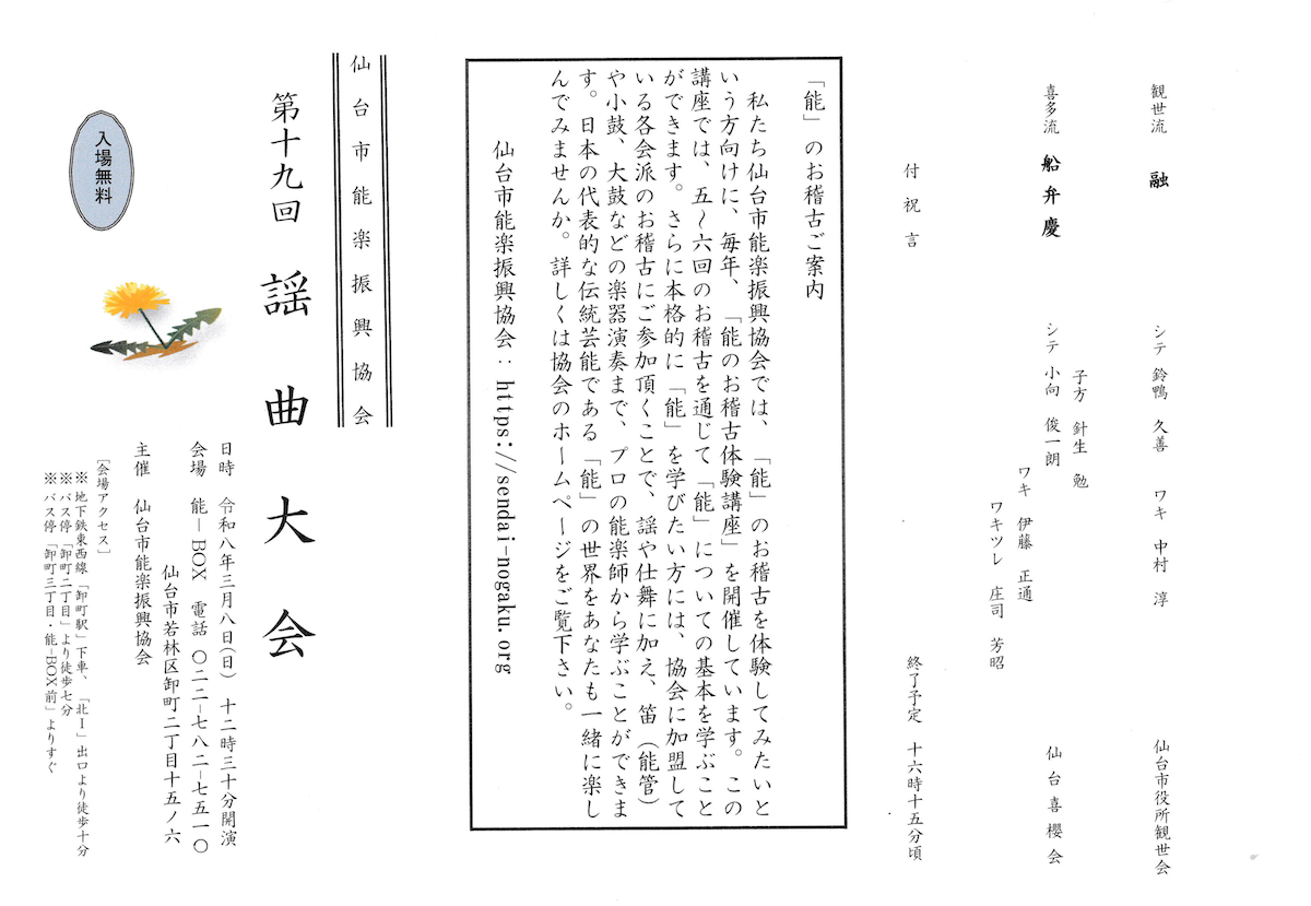 「第19回 謡曲大会」を開催しました(令和8年3月8日) 報告 2026.04.12 喜多流「黒塚」東北電力喜多会 観世流「融」仙台市役所観世会 喜多流「船弁慶」仙台喜櫻会 開会・閉会挨拶 番組 日時 令和8年3月8日(日) 12時30分開演 会場 能-BOX 電話 022-728-7510 仙台市若林区卸町2-15-6 主催 仙台市能楽振興協会 前へ 123